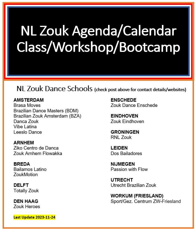 link: https://www.salsa.nl/uitgaansagendas/latin-agenda.phpFor all Brazilian Zouk Parties around Nederland : https://www.facebook.com/groups/360394794448766/ https://www.facebook.com/pg/NLZoukPartyAgenda/events/