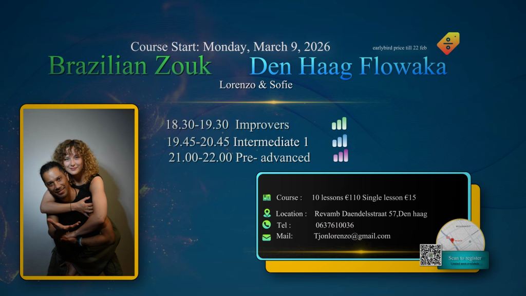 On Monday, March 9nd, 2026, a new season of Brazilian Zouk classes starts at RevamB in Den Haag, led by Lorenzo Tjon & Sofie! 🕺💃